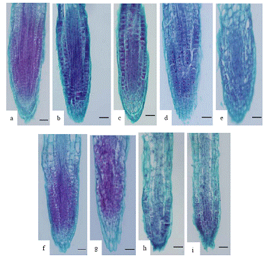 - 本作品研究发现,与对照相比,卡那霉素、潮霉素处理的拟南芥幼苗子叶较小、主根较短,侧根没有形成,且随抗生素浓度的增加主根越来越短,而潮霉素处理的拟南芥子叶、根尤为明显几乎不生长。此外,生长于含卡那霉素培养基上拟南芥幼苗的黄化程度越来越严重、褐化死亡率也越来越高,同时也发现卡那霉素、潮霉素对拟南芥幼苗抑制作用的可逆性非常小。进一步分析发现,抗生素处理的拟南芥幼苗根尖分生区的细胞呈现不规则排列、分裂能力减弱、分化程度明显,且细胞间隙加大,而与潮霉素相比,卡那霉素对拟南芥幼苗根尖的影响较弱。总之,尽管卡那霉素对拟南芥幼苗的影响明显弱于潮霉素,但是它们都抑制了拟南芥幼的生长和发育,也严重影响了其光合作用,从而影响拟南芥幼苗主根的生长和侧根的发生。