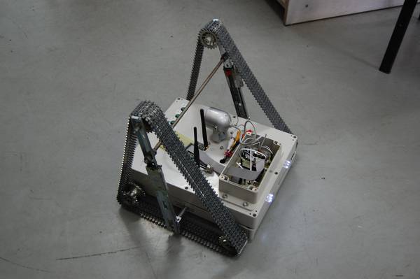 - 上位机控制部分由10个按键组成,分别为前、后、左、右,变形起、落,视频左转、右转。 上位机显示部分由自己写的Labview界面显示。 与现有技术相比,我们的作品是国内外第一个采用可变形的金属履带式机器人。 适用于某些特殊环境,如地震后的灾区,核站的辐射区等人所难以到达的地方。可广泛应用于救援、环境监测、远程监控等各种场合。其市场应用广泛,并且其应用具有非常的必要性。