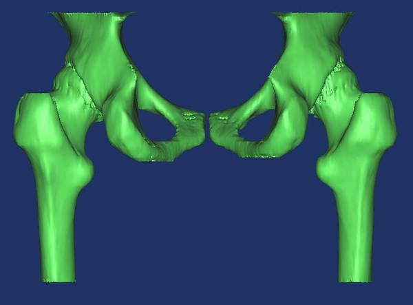 - 本实验中提供的较为精确的测量方法和解剖学参数为临床诊断髋臼畸形和手术提供了依据;三维可视化模型可以任意旋转观察患者的髋关节;有限元模型及虚拟手术方法将有利于临床医师制定髋关节置换手术前方案,确定假体型号和大小的及预见手术效果,显著降低手术风险、提高手术成功率,减少术后并发症,延长假体的寿命,提高假体匹配率。