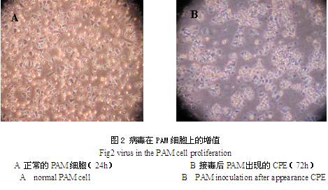 - 本试验将从云南某猪场采取、并经RT-PCR检测为PRRSV阳性的病料(肺脏)处理后接种到猪肺巨噬细胞(PAM)和Marc-145细胞上。接种后三天,猪肺巨噬细胞开始出现堆聚、脱落、崩解;在Marc-145细胞盲传3代后,细胞也出现了相似的细胞病变效应(cytopathic effects,CPE)。将细胞培养物经超速离心、电镜观察,可见呈球形的病毒粒子,直径约为45-55nm;间接免疫荧光检测为阳性;接种PRRS、PRV、CSFV阴性的仔猪,15天后猪只出现体温升高并伴有食欲减退,精神不振等症状,采血经RT-PCR法检测,结果亦为PRRSV阳性。表明成功分离了一株云南PRRSV,命名为YN-1株。其毒力测定为1×10-5.6~1×10-5.7 TCID50/0.1ml。