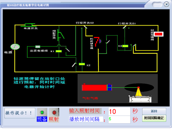 - 钴60治疗机实验教学模型及仿真软件包括钴60治疗机实验教学模型和钴60治疗机实验教学模型仿真软件。 一、钴60治疗机实验教学模型介绍 钴60治疗机实验教学模型主要解决当今钴60治疗机实验教学中存在的学生无法透彻理解其结构和工作原理,更无法亲自动手做实验的实际问题。钴60治疗机实验教学模型是通过下述技术方案实现的:由电路控制单元和气路控制单元组成。电路控制单元由计时控制电路和行程控制电路组成,元件主要由时间继电器、中间继电器和行程开关构成,气路控制单元由出源装置、退源装置、气缸、活塞杆、模拟源、钴头组成,元件主要由两个二位三通电磁换气阀、气源、三联体、可调节流阀、气动管件、气缸、活塞杆、模拟源、钴头和模拟照射口构成。气路控制单元控制两个二位三通电磁换气阀实现气路的进气和排气状态,控制气缸活塞运动,触发行程开关,同时触发时间继电器开始计时(即照射时间)和停止,从而实现气缸活塞智能化移动,将气缸活塞杆上的模拟钴源按计划进出,达到模拟钴60放射治疗机的目的。 由于钴-60治疗机是一种医院大型医疗设备,主要用于对肿瘤的放射治疗,具有强放射性,直接用于实验教学无论从医院工作上,还是同学们身体健康方面上都是不便和不利的。以前的相关实验教学是学生到医院钴60治疗机房去,由老师带领学生快速地边看边介绍一遍,学生无法透彻理解其结构和工作原理,更无法亲自动手做实验。 钴60治疗机实验教学模型可根据实验模型的元件要求配置多组散件,由同一个气源供气,同时组成多组实验,实现学生自己动手组装钴60治疗机原理机的实验教学。 钴60治疗机实验教学模型是一种具有医工、机电、气动等集成技术的教学实验设备,可以开设基本验证型实验、综合型、设计型、应用提高型实验(理解)互相衔接的几个选做实验,分别适用于医学影像工程、影像技术、放射治疗、放射物理、生物医学工程、医疗器械、机电一体化等本科专业实验教学。可以培养同学们理解设备原理,感知电路元件,认知电路图,了解电路控制技术,学会使用电路图,了解气路控制元件,了解气动控制技术;培养设备故障分析能力、检测能力、排除能力,培养动手组装元器件能力等综合能力,从而形成一体化、贯通式完整教学模式,使得同学们由此一种设备的完备实验教学而对其他设备诸类旁通。(其他工科专业也可使用) 二、钴60治疗机实验教学模型仿真软件介绍 钴60治疗机实验教学模型仿真软件配合钴60治疗机教学模型教学使用。同时还可以让学生自学,更加深刻地理解钴60治疗机的原理和结构。钴60治疗机实验教学模型仿真软件的开发结合使用了Delphi 7.0和flash 8等工具。运行环境要求在PC 及其兼容机上运行,英特尔奔腾II以上CPU,64兆以上内存,10G 以上硬盘, Windows操作系统。