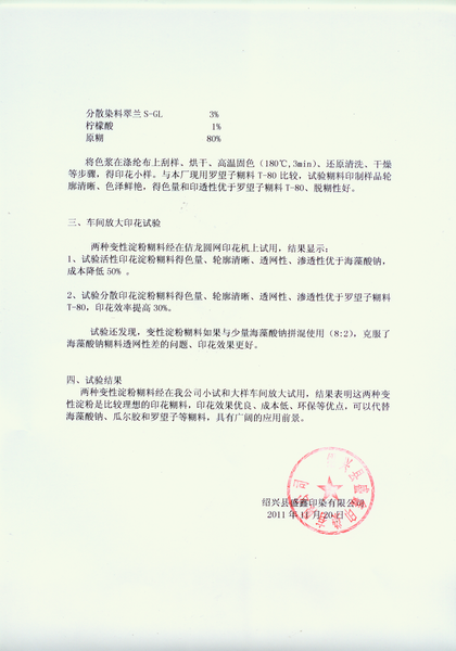 - 郑州纵远印染助剂有限责任公司集研发、生产、销售为一体,为印染和纺织企业提供既可满足环保要求,实现产品升级换代,又可减低生产成本的纺织印染助剂。用户试用数据证明:该产品技术水平和产品质量已达国内领先和国际先进水平。 产品羧甲基淀粉符合国家发展循环经济的战略方针和产业政策,被列为化工部重点开发的六种精细化工产品,印染行业重点发展的五大印染糊料。作为市场上最先进的产品,市场缺口巨大,市场潜力巨大。