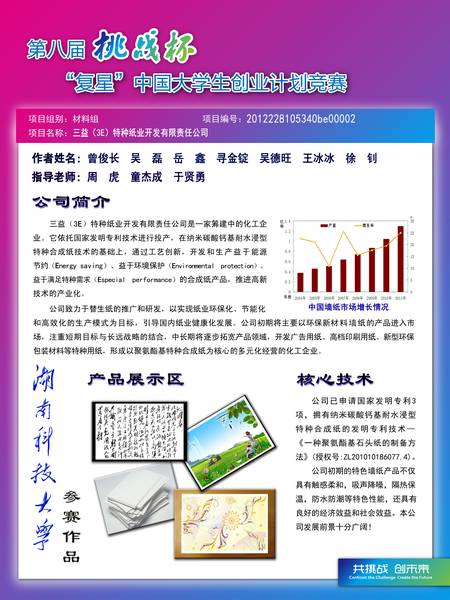 - 三益(3E)特种纸业开发有限责任公司是一家筹建中的化工企业,主要以技术开发为向导,致力于特种合成纸的研发、生产和销售。本公司已申请国家发明技术专利3项,拥有“一种聚氨酯基石头纸的制备方法”专利技术(专利号:ZL201010186077.4),提倡绿色生活新理念,充分利用高校研发力量,为社会提供节能(Energy saving)、环保(Environmental protection)、特种性能(Especial performance)的合成纸产品,推进高新技术的产业化。