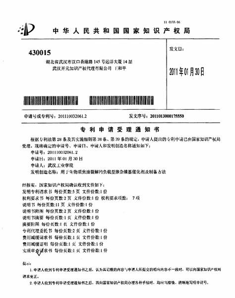 - (1)2010年11月,团队成员公开发表论文《均匀沉淀法制备负载型双金属催化剂的正交实验研究》 (2)2011年2月,该作品系列研究成果申请了国家发明专利(201110032061.2)