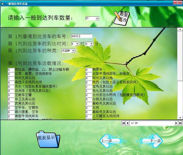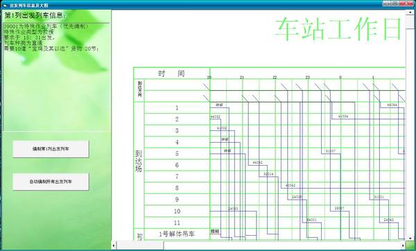 - 作品深入分析了我国铁路车站阶段计划编制的实际状况,通过计算机开发铁路车站阶段计划自动编制软件,其技术进步只要体现在: 1、实现车辆调度数据的动态链接; 2、全面的实现车站阶段计划行车、解体、编组、集结等作业的自动编制; 3、结合调车整场、换班、整修、取送车等时间的安排,引进特殊车辆的处理方法和自动实现,使得车站作业更加协调、完善,具有较强的科学性和一定的创新性; 4、实现可视化操作,界面简洁美观,操作简单方便,具有较强的实用性和可扩展性。