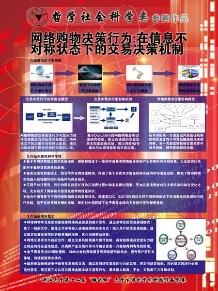 - 本研究通过消费者访谈、问卷调查与平台网站调研的方式,对消费者网络购物的外在影响因素和内在行为机制进行探究。结合改进的网络购物信任理论以及相关前沿进展,系统化的还原消费者在整体网络购物过程中的阶段性行为决策,探究影响消费者网络购物信任感建立的外在因素,揭示出消费者在信息不对称状况下的风险规避模式与交易决策处理方式。同时结合博弈论与信息经济学相关理论,分析从交易意向到交易行为的演化路径。